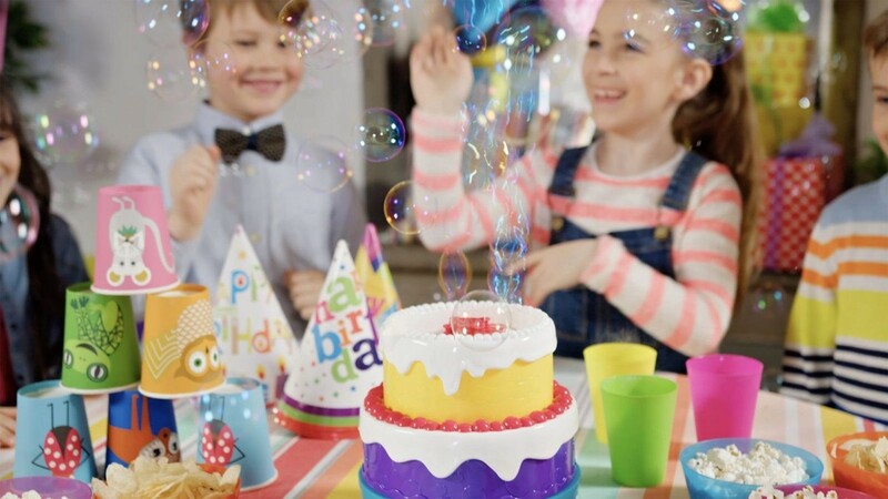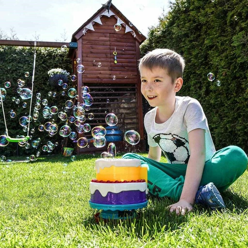 Füllen Sie den Kuchen mit Seifenblasenlösung. Dann drücken Sie einfach den Knopf und genießen Sie jede Menge Seifenblasen.